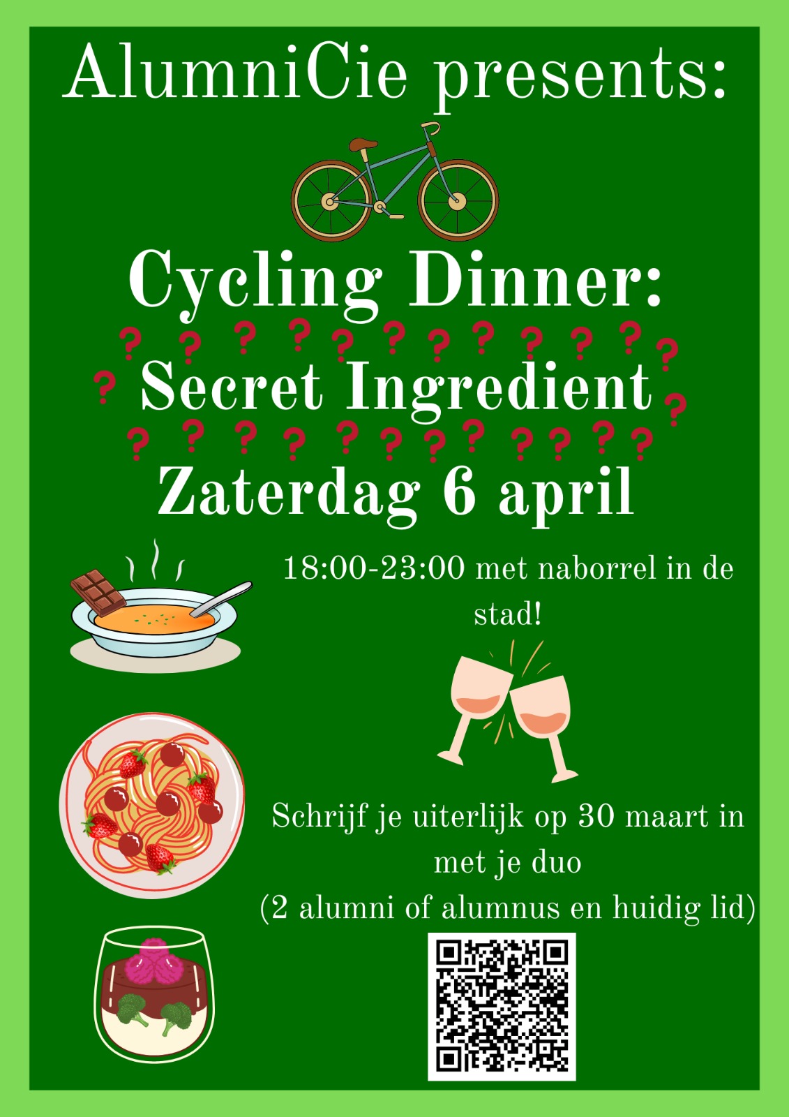 Op zaterdag 6 april is het tijd voor het welbekende cycling dinner met als thema: secret ingredient! Houd er rekening mee dat het cycling dinner van start gaat om 18.00 uur. Het budget per duo ligt rond de 37,50 euro: hiervoor regelen jullie eten en drank voor in totaal 6 personen (je weet zelf vast nog hoe dit werkt). Na afloop van deze alumni-activiteit zullen we met z'n allen verzamelen in een café in de stad voor een naborrel/feestje, locatie volgt nog.