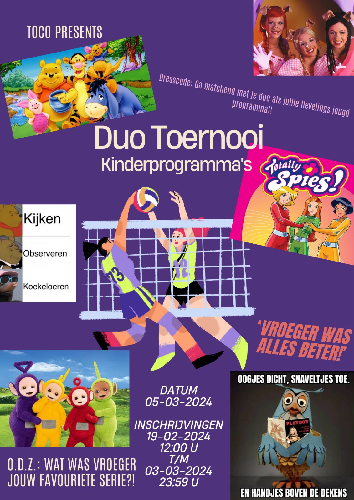 5 maart is weer tijd voor ToCo 3: het welbekende duotoernooi! Ga terug in de tijd met jouw favoriete jeugdseries en -films. Schreeuw alle liedjes van K3 en de drie biggetjes mee, lanceer jouw rocket power, of Moffel wat balletjes weg samen met Piertje. De inschrijvingen gaan morgen open om 12:00 en sluiten op zondag 3 maart om 23:59uur. Er is plek voor 72 duo's in totaal. Het is daarbij belangrijk dat één van de duoleden zich inschrijft en niet allebei! Twijfel niet, ga los met je outfit en ga lekker smurfen bij het duotoernooi op 5 maart! Koekeloeren wij je daar?