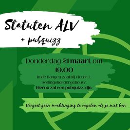 Let op: Op deze ALV gaan we op de wijziging van de statuten stemmen. Deze wijziging is verplicht om te voldoen aan de wet bestuur en toezicht rechtspersonen. Omdat er op de halfjaarlijkse ALV (hALV) een te lage opkomst was, organiseren we deze extra ALV. Hier is een opkomst van 50% niet meer nodig, zoals terug te lezen in onze huidige statuten in artikel 22 lid 3. Het concept van de nieuwe statuten kan je hier vinden. Omdat het instemmen van de statuten niet enorm veel tijd kost, zullen we na de ALV doorgaan met een pubquiz, het is dus zeker leuk om te komen!